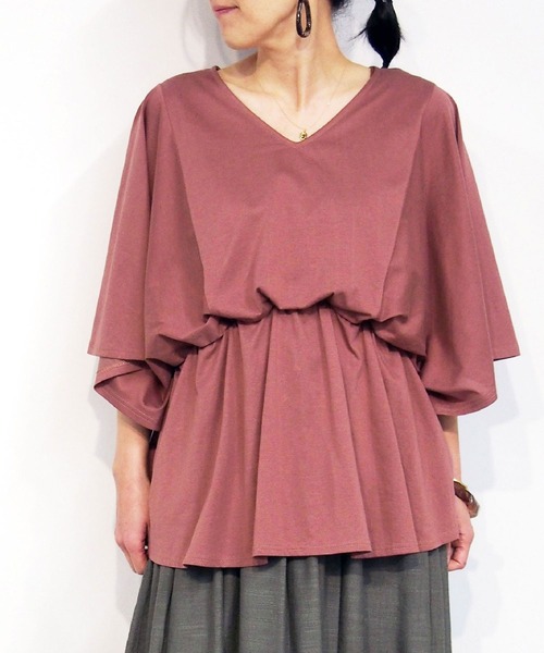 上品な光沢感にあるシルケット天竺のブラウジングデザインカットソー。ウエストのブラウジングが、こなれた印象に仕上がっています。女性らしいフレアー袖もポイント。※屋外での撮影画像は、光の当たり具合で色味が違って見える場合があります。商品の色味は、スタジオ撮影の画像をご参照ください。
