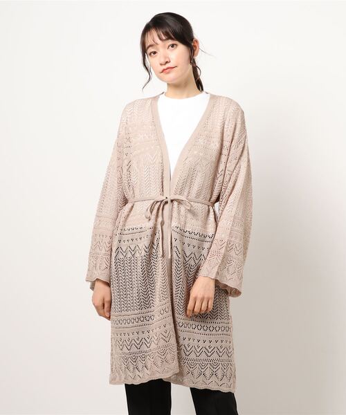 羽織るだけでこなれ感◎な透かし編みロングカーディガン。 透かし編みなので夏でも涼しげに着ていただけます。 インナーさえ変えれば春から秋までロングシーズンご着用いただけるコストパフォーマンスも高いアイテムです。 ウエスト紐は後ろで結んで、スッキリとしたスタイリングにしていただくのがオススメ