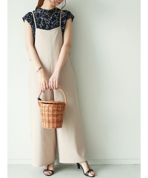 スタイルアップ効果のあるワイドフォルムのコンビネゾン。 バックリボンがコーデに甘さをプラスします。 さりげないサイドボタンが上品な雰囲気を演出。 シンプルなアイテムとのスタイリングでも存在感のある着こなしが完成します。