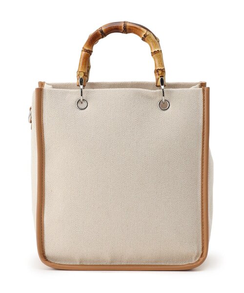 【デザイン】 コットンポリエステル混紡生地をメインに使用したスクエアトートバッグ。 カジュアルさの中に、フェイクレザーのトリミングやバンブーハンドルが大人の雰囲気をプラスする1品です。 スマホや財布、ポーチ、手帳など外出に必要なものがすっぽりと収まるサイズ感で、普段使いに重宝します。 取り外し可能なロングストラップ付き。 ※ポケット数:内側×2 店舗へのお問い合わせ商品番号:F97-02053 ●製品寸法: 00:高さ24.5cm 幅(上部)23cm 幅(下部)22.5cm マチ10.5cm 持ち手上がり8cm 付属ショルダー対応サイズ61.5~117cm 備考:重量:約355g
