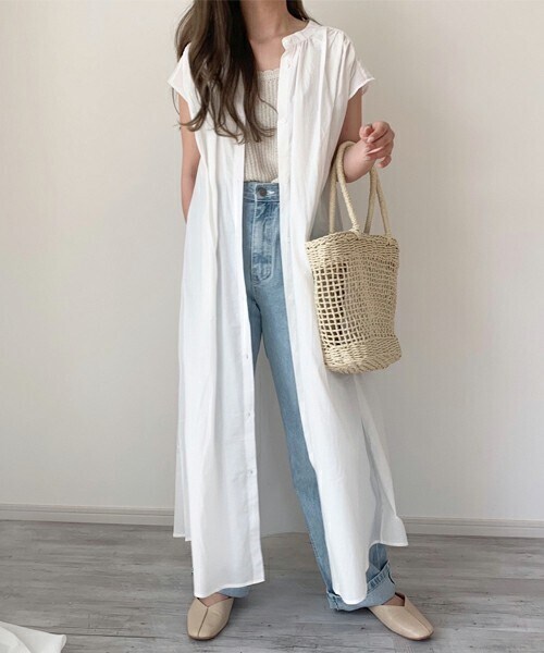 着痩せして見えるフレンチスリーブのロングシャツワンピ。 羽織にしたり、ワンピースとして着たり、 ブラウジングしたりと着回し力も抜群です◎ さらっとした夏にぴったりの素材なのも嬉しいポイント。