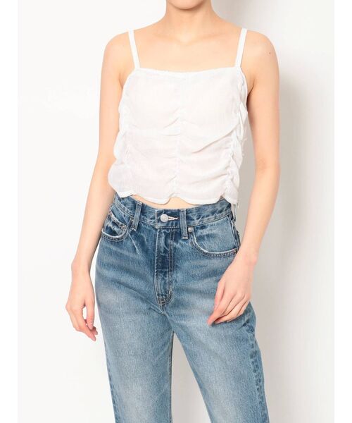 身頃に入ったシャーリングがポイントのクロップドトップスです。 パッド入りのため一枚で着用できます。 ※肩ストラップで調節可能