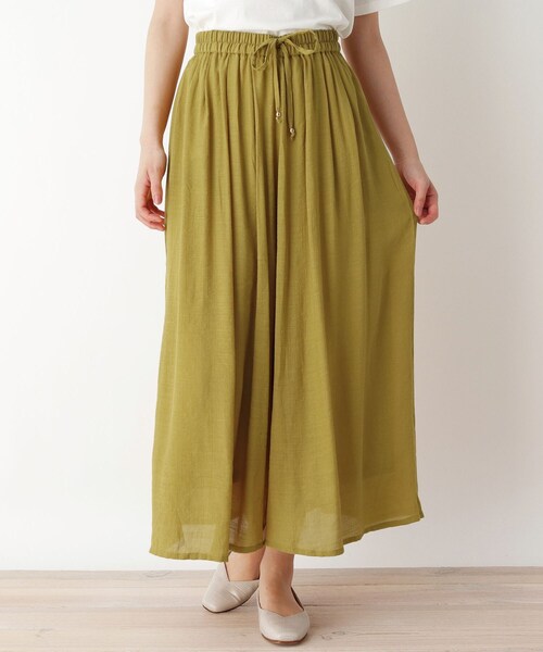 【デザイン】ほどよいボリューム感でスカート見えするワイドパンツ。サンダルやスニーカー合わせにお勧めの丈感。ウエストはゴム仕様なので、心地よくフィットしてくれます。※ポケットなし【生地感】スラブの表面感が魅力のふわりと揺れる品の良い素材です。全体に裏地あり。モデル情報:身長166cm B78 W59 H86 着用サイズ:38(M)店舗へのお問い合わせ商品番号:763-62212●製品寸法:36(S):W65~103cm 股下51cm 前股上33cm 渡り幅51cm 裾幅56cm38(M):W68~106cm 股下52cm 前股上34cm 渡り幅52cm 裾幅57cm40(L):W71~109cm 股下53cm 前股上34cm 渡り幅53cm 裾幅58cm42(LL):W74~112cm 股下54cm 前股上34cm 渡り幅53cm 裾幅59cm44(3L):W78~116cm 股下54cm 前股上35cm 渡り幅54cm 裾幅59cm備考: