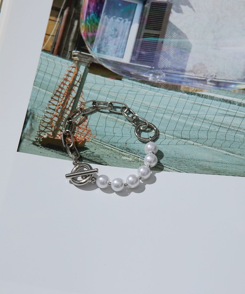 【デザイン】 パール調のビーズとチェーンを組み合わせたハイブリッなブレスレット。 トレンドのパールを部分使いしたことで、コーディネートに取り入れやすいデザインになっています。 T字の留め具もデザインポイントになっています。