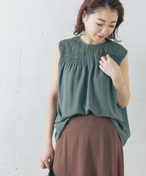 【繊細なシャーリングディテールが魅力のチュニックブラウス】 シルクのような光沢をもつポリエステル糸を使用した、アムンゼン生地のブラウス。 ソフトワッシャーをかけたような表面感とサラっとした風合いで、清涼感のある着心地良い素材です。 チュニック丈のシンプルなシルエットですが、シャーリングを贅沢にあしらい、ジャケットやカーディガンを羽織ったときにもバランスが良く見えるようなデザインに仕上げました。 手洗い可能でご自宅でお手入れして頂けることも嬉しいポイント。 ◆STYLE 一枚ではもちろん、キャミワンピースやサロペットとのレイヤードスタイルにもおすすめ。 カラーはクリーンな印象のオフホワイト、上品なモカベージュ、カジュアル感ある色褪せたダスティブルーの3色展開です。 [キャミソール] FREE : 肩幅27cm / 総丈56~63cm / 前身頃47.5cm / 後身頃47cm / 身幅43cm ※商品画像は、光の当たり具合やパソコンなどの閲覧環境により、実際の色味と異なって見える場合がございます。予めご了承ください。 ※商品の色味の目安は、商品単体の画像をご参照ください。 ----------------------------- 透け感:ややあり 伸縮性:ややあり 裏地:あり 光沢:なし ポケット:なし -----------------------------