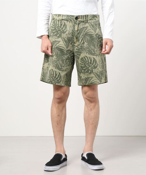 アーミーグリーンのコントラストで彩られたボタニカルがシックに決まるコットンサテンのショーツ。