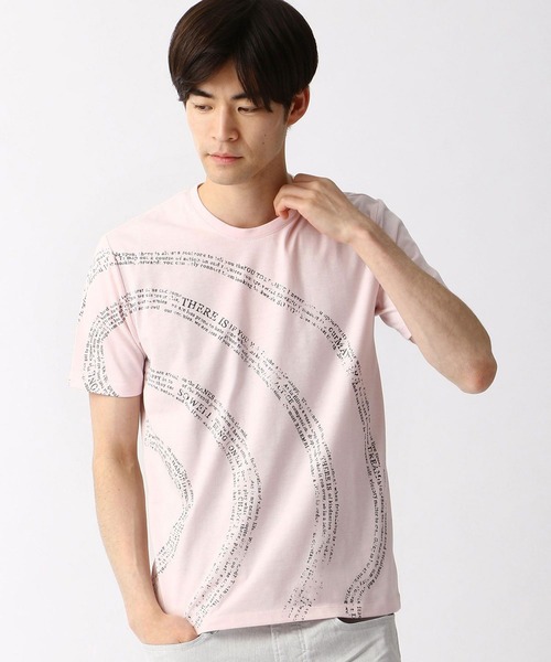 程よい厚みの40/2天竺を身生地に使用しています。前身頃、後身頃、右袖にまたがる大胆な渦巻状のロゴプリントが印象的なプリントTシャツです。※画像の商品はサンプルです。実際の商品とは仕様・加工・サイズ・素材が若干異なる場合がございます。