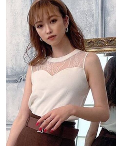 \毎年人気!デコルテデザインがポイントのトップス/今の季節にぴったりなレース切替ノースリニットトップス。スッキリとしたシルエットで女性らしいスタイリングに!スタイルハイウエストボトムにトップスインをしたコーディネートがイチオシ◎ノースリなのでシアーカーデやライダース合わせでも袖が響かずスッキリと着ていただけます。《 お気に入り登録「♡」がおすすめ! 》RESEXXYのお得な情報をいち早くGETできます◎♥:アイテムをお気に入り⇒ SALE START / 完売COLOR再入荷 / LAST1点 etc...♥:ブランドをお気に入り⇒新商品 / 再入荷 / クーポン・セール情報 etc...【商品特徴】透け感:なし伸縮性:ややあり生地の厚さ:普通サイズ感:細身裏地:なし