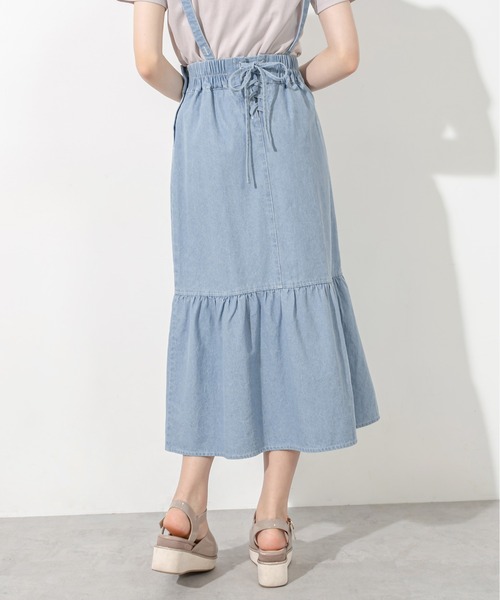 サスペンダー付きの新作マーメイドスカート 注目のマーメイドスカートにサスペンダー付デザインが新登場! ■デザイン ・柔らかく肌触りの良い、配色ステッチが効いたコットン素材なので生地の落ち感もあり、裾のフレア部分が女性らしい印象に。 ・腰回りはスッキリとしたシルエットのフレアスカート。 ・マーメイド調のラインなので、サス付きでも大人っぽい印象でコーディネート出来ます。 ・バックのレースアップデザインで後ろ姿も抜かりなくレディな印象に。 リラックスしたデニムスタイルを楽しみたい大人の女性にオススメ! ・サスペンダーは取り外し可能で、ハイウエストスカートとしても着て頂けます。 ・今季人気のデニムで長いシーズン使い回せる注目のアイテムです◎ ■スタイリング ・Tシャツ合わせでガーリーカジュアルMIXも楽しめます。 ・袖コンシャスなトップスでレディライクなスタイリングも取り入れやすい○ ・セーラーカラーやビッグカラーなどトレンドのブラウストップスで旬なスタイルが完成します♪ ----------------------------- 裏地:なし 光沢感:なし 透け感:なし 伸縮性:なし 生地の厚さ:薄手 ----------------------------- model:165cm 着用サイズ:FREE 【デニム】 デニム製品の特性上、着用や洗濯によって「色落ち」「色移り」が生じます。 デニム製品の特性をご承知の上、色合いの変化をお楽しみください。 ・ご着用中の摩擦等により移染します。白・淡色系の衣服、ハンドバッグ、靴、シート等は特にご注意ください。 ・デニム製品が雨水や汗で濡れると、より色移りしやすくなります。 ・洗濯により洗液がにごり移染しますので、他のものと一緒にしないで単独でお洗いください。 ・洗濯後濡れた状態で放置されますと色移りしやすくなります。 ※ご覧のモニター環境や撮影環境により実際の商品と多少色味が異なって見える場合がございます。 ご理解の程よろしくお願いいたします。