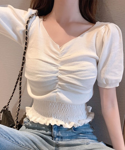 【素材・着用感】 ・素材の厚み⇒薄手 ・透け感⇒あり ・裏地⇒なし ・着用感⇒普通 ・伸縮性⇒あり ※デザイン上透け感がございますので、インナーの着用をお勧め致します。 ※モデル着用感は目安となり、体型には個人差がございますので、参考程度でご確認ください。 【仕様】 ・商品内容…トップス ・付属品…なし ・ファスナー…なし ・ボタン…なし ・ポケット…なし 【商品説明】 ◆アイテム◆ 胸元ギャザーのハイウエストサマーニットソー。 シャーリングウエスト+ギャザーデザインがフェミニンな印象を与えてくれます。 ◆コーディネート◆ ハイウエストデニムとの相性が抜群です◎ ジャンパースカートやサロペットとの組み合わせにもおすすめです。 ※着用時のご注意※ ◆ニット素材を使用しているため、商品サイズに若干の個体差が生じます。 梱包時に生地の目が詰まっている場合がございますので、着用時に少し手で伸ばし馴染ませてからご着用下さいませ。 また、染色方法により同じ商品でもお色味によって若干のサイズ差がある場合がございます。 (主に濃い色のサイズがやや小さめになってしまう傾向がございます。) 誠に恐れ入りますが予めご了承くださいませ。