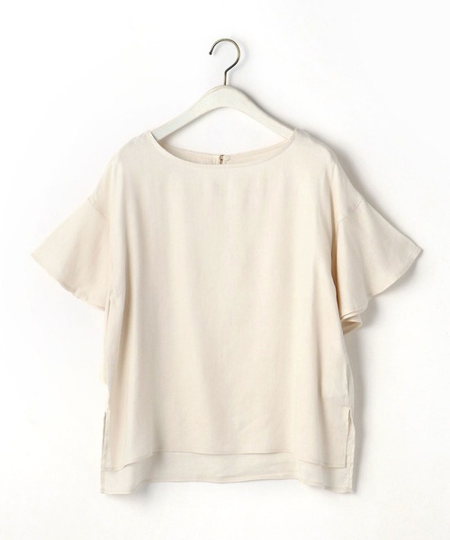 夏らしいドライタッチのフェミンにブラウス。さりげない袖のフレーアスリーブが女性らしく華を添えてくれる1枚に仕上がっています。※屋外での撮影画像は、光の当たり具合で色味が違って見える場合があります。商品の色味は、スタジオ撮影の画像をご参照ください。
