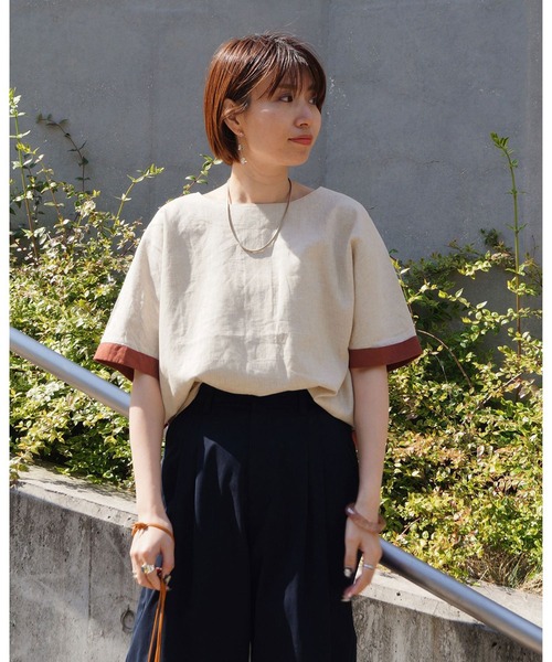 夏らしいリネン混素材のバイカラーブラウス。落ち着いたカラー配色が大人顔に仕上がっています。カジュアルボトムはもちろん、フェミニンなスカートとも相性◎※屋外での撮影画像は、光の当たり具合で色味が違って見える場合があります。商品の色味は、スタジオ撮影の画像をご参照ください。