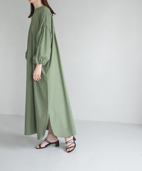 ■デザイン■ 春に即完売した936774 2WAYパフワンピースの夏版。袖を少し短くしました。 たっぷりとしたシルエットに袖口のギャザーが映えるロングワンピース。 前後2WAYでも着用が出来る、抜け感のあるデザインもポイントです。袖口はゴム仕様なので、たくし上げた時の パフ感も様になりニュアンスを加えてくれます。 ■スタイリング例■ ワンピースとしてシンプルに着ていただくのがお勧めです。前後でデザインの違いをお楽しみいただけます。 【yuw シーズンテーマ】 なぜか目にとまる静かな存在感のある服。 遠くから見るとシンプルなのによく見るとこだわりを感じる。 さまざまな要素をちょうどいいバランスでシンプルな特別感を表現