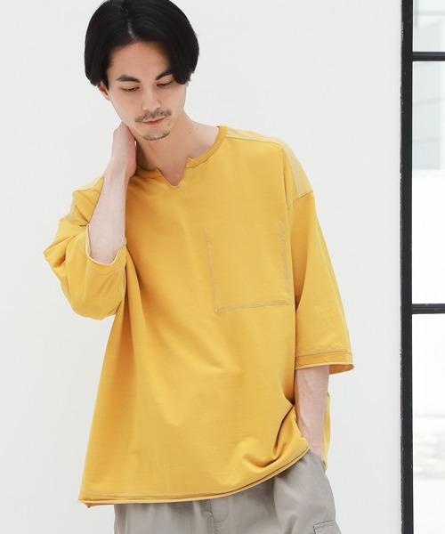 着こなしを広げる2WAYTシャツ 表面がコットン、裏面がポリエステルのプレーティングで、裏表両方着れる2WAYのキーネック仕様のTシャツ。 裏面のポリエステルに吸水速乾機能がついており、快適な着用が可能。 裏面左下の品質表示は粗ミシンになっていて、取り外しが簡単に出来るようになっています。
