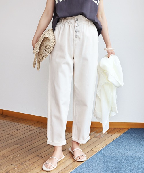 クタッとしたコットンの風合いがナチュラルで 抜け感たっぷりなデザインチノ・パンツが入荷しました。 ギャザーを寄せた腰まわりは、 ハイウエスト・シルエットで今年らしく♪ ボタンフライでフロントにアクセントを プラスしたデザインもポイントです。 ウエストゴム入りで楽ちん! サイド&バックポケットあり。 そのままサラッと着るのはもちろん、 シューズに合わせて裾をロールアップすれば 抜け感のあるスタイリングに決まる、 今シーズンのおすすめアイテムです! 裏地なし ※撮影時のライティング、ご覧になっているモニター・PC環境により 実際の商品と色味が異なって見える場合がございます。 ご了承の上お買い求め下さい。 素材: 綿100% ≪備考≫ 伸縮性:なし 透け感:なし 生地の厚さ:やや厚手 肌ざわり:さらっとしている その他:クタッとした風合いあり 生産地:バングラデシュ 手洗い:可 ドライクリーニング:可 ウェットクリーニング:可