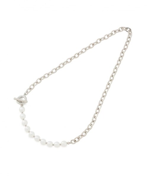 【デザイン】パール調のビーズとチェーンを組み合わせたハイブリッなネックレス。トレンドのパールを部分使いしたことで、コーディネートに取り入れやすいデザインになっています。T字の留め具もデザインポイントになっており、前に垂らして着用するのもおススメです。