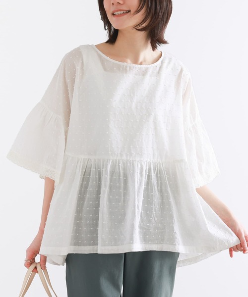 ■デザイン 華奢見せを叶えるギャザー切り替えと、ドット柄のドビー生地が品良く映えるトップス。袖口にはレースをあしらい、女性らしいワンポイントに。 ■素材 さり気ない凹凸感が特徴の、コットン100%のドビー生地を使用。さらりとした心地良い肌触りで、透け感のある軽やかな生地です。 ■コーディネート デニムなどのカジュアル要素をプラスすると、甘すぎず程良く大人可愛いコーディネートが完成します。ギャザーで裾がやや広がったシルエットのため、パンツスタイルがおすすめです。