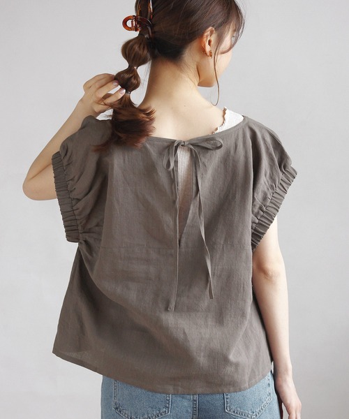 夏らしいナチュラルな風合いのリネンブラウス。 太めのゴムを使用した袖口で、デザイン性のある1枚に仕上げました。 ゆったりとしたサイズ感で抜け感をプラス。 バックリボンが女性らしく、後ろ姿も抜かりなく演出してくれます。 ワイドパンツと合わせたカジュアルなスタイルはもちろん、 ロングスカートとのレディライクなコーディネートもおすすめです。 大きく開いた襟ぐりでデコルテラインを綺麗に見せてくれます。 広めの袖口で華奢見え効果も◎ 清涼感漂うコットンリネン素材。 軽やかな肌触りで暑い時期にピッタリの生地です。 - - - - - - - - - - - - - - - - - - - - - - - - - - - - - - - - - 透け感:ややあり 裏地:なし 伸縮性:なし 光沢感:なし - - - - - - - - - - - - - - - - - - - - - - - - - - - - - - - - - ※ 撮影時の照明などの環境と、モニターに表示される色味がメーカーにより変わってしまう等の理由により、実際にお届けする商品と、ご覧になられているアイテムの色が若干異なる場合がございます。ご了承下さいませ。