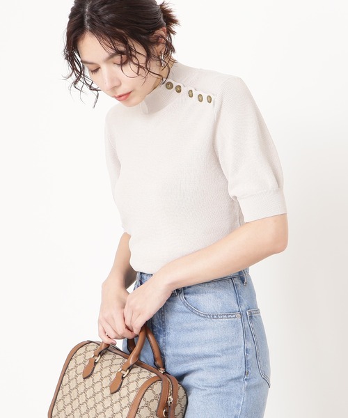 多数のリクエストありがとうございます!皆様の声にお応えして、再々追加生産決定!アシメトリーにスコッチ釦をあしらった5分袖ニット。少し立ち上がるボトルネックラインから肩先にむけて、水牛のような高見えする釦使いが特徴。ややふんわりとしたスリーブデザインで取り入れやすく、フェミニンな雰囲気をプラス。ボディラインを拾いすぎないシルエットは着心地が良く、ボトムを選ばずオンもオフにもおすすめです。※こちらの商品は【スコッチボタン五分袖ニット/166-1170556】同型・同素材のお品物になります。