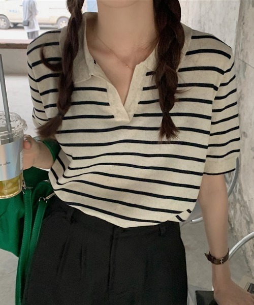 『"stripes polo knit"』〇Design〈IVORY・BLACKの2色展開〉・定番のボーダー柄がキュートなポロシャツ型になったニットトップス。・ベーシックなカラー展開で着回し力も抜群。・シンプルなボーダー柄が使いやすく、どこかボーイッシュな印象も持つアイテム。・トレンドライクなポロ襟デザイン◎・細めのボーダーで上品さを演出。・さらっと着れる素材感と、程よくルーズなシルエットで抜け感を。・カジュアルからキレイめまで幅広くお使いいただけます。〇Styling合わせるボトムを選ばないボーダー柄トップスは、定番のデニムやスキニー、ワイドパンツでカジュアルに着こなしたり、スラックス×ヒールシューズで大人っぽくも◎ショートパンツやハーフパンツでラフなスタイルもおすすめ!オールインワンやキャミワンピのインナーとしてレイヤードにもピッタリです。女性らしいスタイルには、タイトスカートやマーメイドスカートですっきりとまとめたり、フレアスカートやプリーツスカートで上品なスタイリングも。デイリーに着回ししやすいアイテムとなっています。韓国ファッションが好きな方は是非。こちらの商品はセレクト・インポートアイテムのためサイズ感が日本規格のものとは異なります。お買い上げの際にはサイズチャートでご確認頂きますようお願いいたします。【お買い物をよりお楽しみいただくために】●商品のお気に入り登録(ハートマークをクリック)完売カラーの再入荷や、ラスト1点のお知らせ、セール情報などの通知を受け取ることができます。●ブランドのお気に入り登録新商品や再入荷など、お得な情報をいち早く受け取ることができます。●最短で翌日お届け商品をカートに入れた後、注文内容の確認ページで「即日配送」を選択していただければ、最短でご注文した翌日にお届け致します。是非ご利用頂き、お買い物をお楽しみください。※ご注文いただいた予約商品のお届け時期の確認は、注文履歴ページより行えます。
