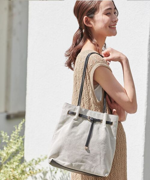 【デザイン】 細ハンドルのタックデザインが、シンプルでスタイリングに合わせやすい縦長トートバッグ。 トレンドのノットを採用したフロントベルトにはきらりと輝くメタルパーツをあしらいポイントに。 長めのハンドルで肩掛けしやすくなっています。 フェイクレザーと生地、PP素材を切り替えた、カラーによって印象の異なる異素材コンビになっております。 ※ポケット数:内側×3 店舗へのお問い合わせ商品番号:769-02045 ●製品寸法: 00:高さ27cm 幅(上部)24cm 幅(下部)26cm マチ9cm 持ち手上がり29cm 備考:重量:約260g(サンプル重量)