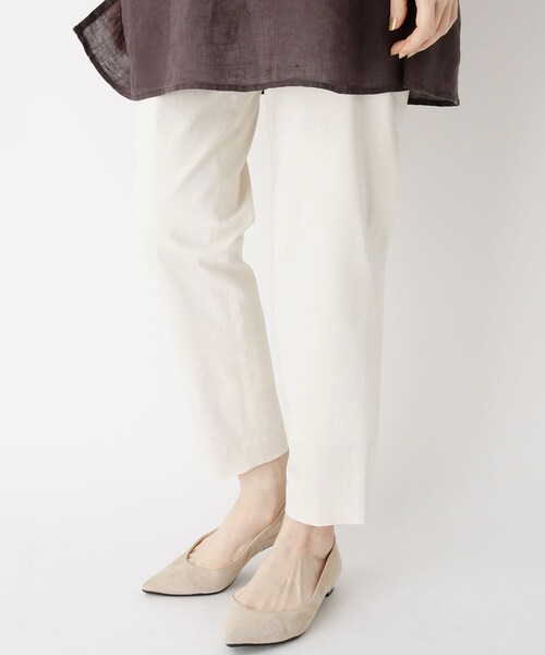 【デザイン】 裾に向かってやや絞ったテーパードライン&足首が覗くクロップド丈が脚のラインをスッキリ見せてくれるパンツ。 無駄な装飾を省いたシンプルなルックスは合わせるトップスを選ばず、クローゼットの定番として愛用していただける一本です。 バックウエストはゴム仕様で楽な穿き心地にもこだわっています。 ※ポケット数:横×2 後ろダミー×2 【生地感】 コットン(綿)に麻を混紡し、ストレッチの効いた柔らかな風合いの中にハリコシのある素材です。 ホワイト(002)のみ裾上までの裏地付き。 こちらの商品は主に夏に着用いただける商品です。 モデル情報:身長162cm B78 W60 H85 着用サイズ:09(M/ミセス) 店舗へのお問い合わせ商品番号:575-62650 ●製品寸法: 07(S/ミセス):W69cm H94cm 股下63cm 前股上24cm 裾幅16cm 09(M/ミセス):W72cm H97cm 股下63cm 前股上24cm 裾幅16cm 11(L/ミセス):W75cm H100cm 股下63cm 前股上24cm 裾幅17cm 備考: