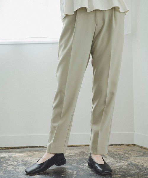 ストレッチ性のあるダブルジョーセットを使用したキレイめテーパードパンツ。腰まわりから裾にかけて絞られているテーパードシルエットです。 センタープレスが入り、レッグラインをキレイに見せてくれるシンプルなデザイン。 フェミニンなシャツブラウスやニット、カジュアルなTシャツまで相性抜群。 ONもOFFスタイルにも着まわしできます。後ろウエストはゴム仕様でフィットし、楽な穿き心地です。 ※こちらの商品はSサイズの展開がございます。 ◆サイズ目安◆ Sサイズ→身長153cm~156cm ウエスト60cm~62cm