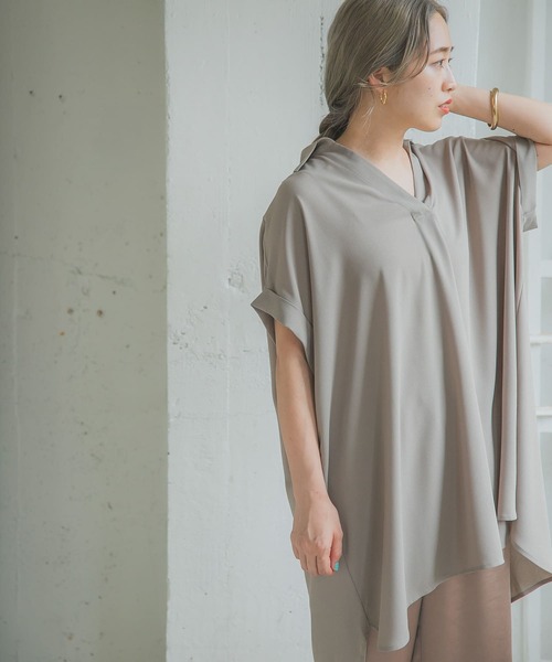 シワになりにくい生地を使用したチュニック丈のシャツ。ネック部分にスキッパーデザインを採用し、抜け感のあるディテールに仕上げました。体のラインをひろわないゆったりとしたシルエットなので、体型カバー&楽な着心地が嬉しいポイント◎袖丈も二の腕をすっぽり隠してくれる絶妙なサイジングに仕立てました。 ※商品画像は、光の当たり具合やパソコンなどの閲覧環境により、実際の色味と異なって見える場合がございます。予めご了承ください。 ※商品の色味の目安は、商品単体の画像をご参照ください。 ----------------------------- 透け感:あり 伸縮性:ややあり 裏地:なし 光沢:ややあり ポケット:なし -----------------------------