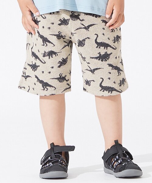 BREEZE(ブリーズ)のパンツ「ダイナソーパイルパンツ_恐竜 5分丈」は、恐竜のシルエットの総柄デザイン♪柔らかいパイル生地を使用しているため、はき心地もGOOD!