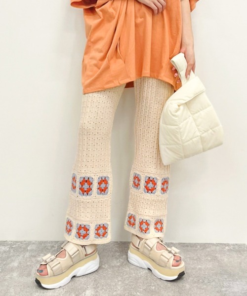 【デザイン】 今シーズン大注目の サマーニットに新作が登場! かぎ針編みのニットは 裾に施されたカラフルなグラニースクエアがアクセントになった とびきりキュートなイージーパンツです♪ 程よい透け感でサマーシーズンも快適に着用していただけます。 チュニック丈など着丈が長めなトップスとの相性抜群です! 【素材】 お手入れしやすく、肌触りのよい素材 【スタイリング】 コーディネートのアクセントになるアイテムなので、シンプルなオーバーサイズのTシャツや チュニックトップスを合わせたこなれコーデがおすすめ! 同シリーズのビスチェと合わせた上級セットアップスタイルも♪ ※屋外の光や照明の当たり具合で、実際の商品と画像の色味に違いが発生する場合がございます。