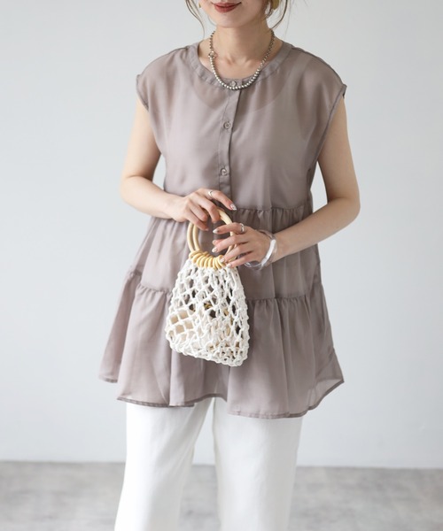 ★旬顔ティアードノースリーブブラウス★《スタイリング》透けるのでキャミソールやタンクトップをインナーに。丈長めなので細いパンツなどと合わせても◎トレンドのプリーツパンツ、スラックス、デニムなどなににでも相性抜群!!《ポイント》清涼感のあるシアー素材のチュニックブラウス。シアーのティアードデザインが女性らしい雰囲気に♪※裏地なし※透け感あり★インフォメーション商品のお気に入り登録♡で再入荷の通知や、ラストの通知、セール通知も受け取ることができます。instagram➡_4youstory_