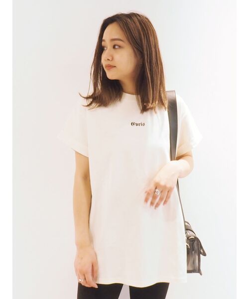 オーバーサイズのTシャツで小柄な方はチュニックっぽく着用もできます。 袖のロールアップデザインがポイントでこなれ感のでる1枚になっています。 フロントに染み込みプリントでさりげなくEVRISのグラフィックが入っています。