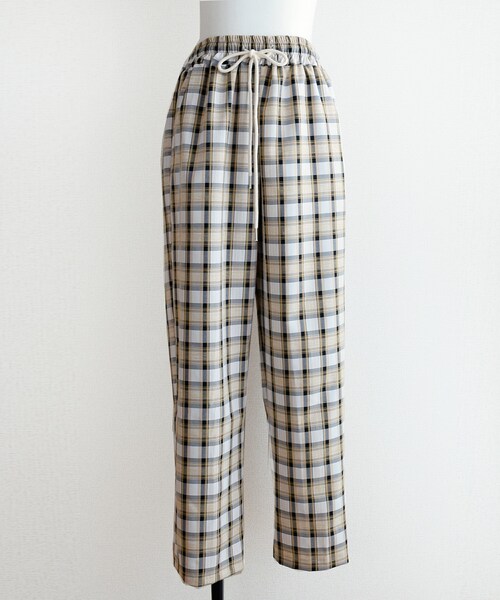 ◆アイテム詳細◆ 淡いチェック柄を使用したチェックワイドPT。 ウエストはギャザー仕様でリラックス感あるシルエット。 まっすぐ落ちるストレートラインで仕上げました。 存在感のあるチェック柄の為、ゆるっとなり過ぎないようシルエットにこだわり大人の雰囲気が叶います。 サラりとしたレーヨン素材はシーズンレスで、デイリーユースにぴったり。 夏場マンネリしがちなトップスとボトムスの組み合わせに新鮮さがプラスできるパンツ。 パンツを主役にトップスはシンプルに合わせるコーディネートはもちろん、カジュアルにロゴやプリントなどの色とリンクさせるコーディネートもオススメ。