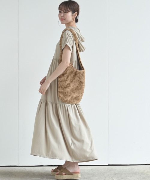リラクシーで可愛いフーディーワンピトレンドのティアードデザインが女子力高めのワンピース。柔らかな綿混カットソーとゆとりのあるシルエットがリラクシーなアイテムです。どこから見ても可愛く、また顔周りに表情を与えてくれるフードデザイン。スポーティーな雰囲気で甘すぎない大人カジュアルなスタイルが楽しめます。袖口はロールアップで二の腕の細見えも◎。お出かけもおうちスタイルもこの1枚で♪裏地なし伸縮性あり薄手サイドポケットあり袖口折り返しは縫い合わせてあります織キズやだま等みられる場合もございます洗濯:手洗い可