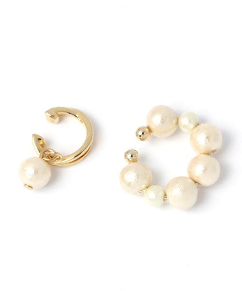 コットンパールで作った2個セットのイヤカフ。一つは大小サイズの違うパールのデザイン。もう一つは一粒のパールがついた小さめなイヤカフです。一つ付けも重ね付けもしやすいデザインとなっています。
