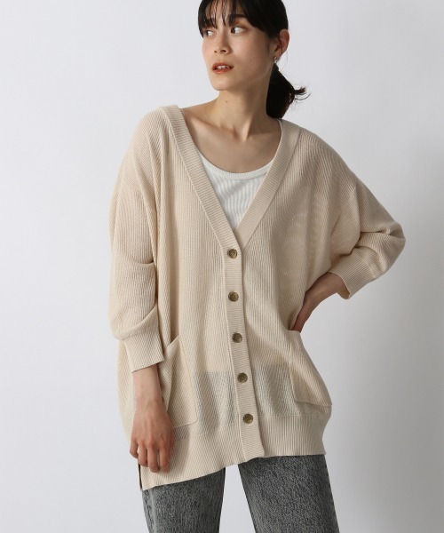 羽織として使いやすいミドル丈カーディガン。春に販売していた941274 12GボタンミドルカーディガンLSより薄手に仕上げて、袖丈も短く、七分袖に変更しました。透け感のある振り編みが清涼感のある仕上がりで夏にぴったりの1枚です。大きめのパッチポケットがポイントです。 軽く羽織るカーディガンとして気温対応にも使用できます。インナーは柄のタンクやアメリカンスリーブなどデザインのあるアイテムと合わせるのがおすすめです。ボトムスはパンツでもスカートでも合わせやすく、着回ししやすいカーディガンです。