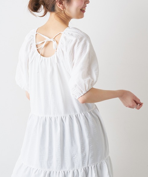 【2021SS natural couture】 大人ガーリーなデザインを上品カラーで仕上げました◎ ■Design ティアードを贅沢に施し、程よいボリューム感に仕上げた1着。 十分な着丈と、二の腕をカバーしてくれる袖感で、華奢見せ効果も期待できます。 バックスタイルは、さりげない肌見せと、お好みで結んで頂けるバックリボンがポイント。 ■Styling 1枚でシンプルに着て頂くのはもちろん、デニムやレギンス合わせで変化をつけても◎ お好みでウエストにベルトマークして頂くと、すっきりとスタイルアップなシルエットに 仕上がります。 ■Fabric さらっとしたポリエステル素材を採用。 着心地涼しげで、ロングシーズン愛用頂けます。 ================ 透け感:アイボリ―はややあり 裏地:なし 伸縮性:なし 光沢感:なし 生地感 :さらっとした生地感 ================ 【お気に入り登録でお得な情報がいっぱい】 ・「商品のお気に入り登録」で再入荷通知や、ラスト1点の通知、セール通知をいち早く受け取ることができます。 ・「ブランドのお気に入り登録」で新商品や再入荷など、お得な情報を受け取ることができます!