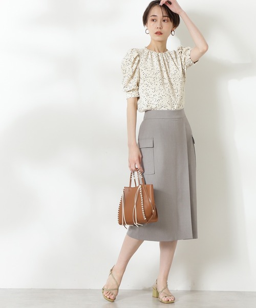 フラップポケット付タイトスカート。すっきりとした品の良い膝下丈のタイトラインです。フロントはラップ風のように生地の重なりや、裾にスリットを入れており、足運びがしやすいです。ワークテイストのようなフラップポケット付ですが、デザインや素材感がきれいめなのでONスタイルに活躍します。※裏地付き