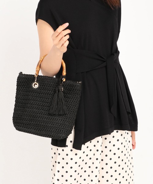 上品見えする、涼し気な印象のラッセルバッグ。バンブーハンドルが大人っぽさをプラスします。 揺れるタッセルがアクセント。 ショルダーにもなり使い勝手のいい1点です。