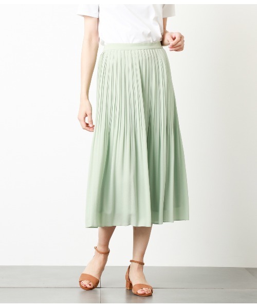 上品な爽やかさが魅力 すっきり見えスカート繊細で女性らしい印象を叶える、チリメンジョーゼットのロングプリーツスカート。歩くたびに揺れる裾が、上品で優雅な雰囲気です。合わせるアイテム次第できれいめでもカジュアルにも、幅広くお召しいただけます。カラー展開はニュアンスのあるモカベージュと、爽やかなミントグリーンの2色をご用意。■素材チリメンジョーゼットが繊細で上品な印象。透け感が涼しげで、軽やかにお召しいただけます。また、ご自宅でのお洗濯(ハンドウォッシャブル)が可能なため、汗ばむ季節でも手に取りやすいところがポイントです。■デザイン裾の落ち感が心地よく、エレガントな雰囲気。裏地が重ならない裾部分の透け感が、丈の長いロングスカートを涼しげに演出してくれます。また、ウエスト部分には細かなプリーツを入れたことでかさばりにくくなり、気になるヒップ回りのボリュームを軽減してくれます。また、裾にかけてプリーツを消しているため、広がり過ぎず、すっきりとしたシルエットに。さらに、後ろウエストがゴム仕様のため、穿き心地の良さも魅力。■コーディネートモカベージュはトップスに濃色のアイテム(品番:51-85-2662)を合わせることで、シックでモダンな印象に。ミントグリーンはホワイトのトップス(品番:51-85-2553)で、清涼感ある夏らしいコーディネートに仕上がります。■シーズン2021年春夏商品