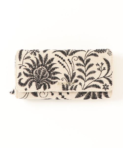 植物柄の刺繍をあしらった長財布、Maria。カードや紙幣を収納できる豊富な収納を備え、小銭を収納できるファスナー仕様のワイドポケット付き。ファスナー開閉で、ファスナーのスライダーにはメタリックのロゴをプラス。
