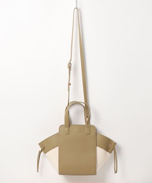 柔らかな質感の合皮とキャンバス生地の異素材コンビバッグ。扇のようなデザインがエレガントな印象を演出。サイドで結んだコードもさりげないポイントです◎しっかりとマチ幅がるので収納もしやすく、内側にはポケット付き。ショルダーバッグとしても使えるベルトが付属しています。カジュアルから綺麗めコーデにと、様々なスタイリングともバランスよくマッチしてくれるアイテムです。