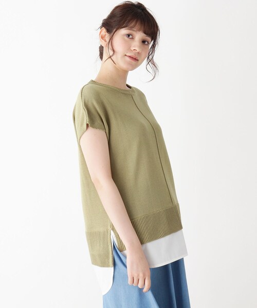 【デザイン】夏でも着られるドライタッチでカジュアルなムードのニット。裾からシャツテイルがのぞくレイヤードスタイルが魅力です。ヒップが隠れる長めのトレンド丈。シルエットが間延びしないようセンターに切り替えを入れています。【生地感】シャリっとしたリネンライクで爽やかな着心地。裾の布帛はハリのあるコットン(綿)混ブロードを使っています。モデル情報:身長168cm B75 W60 H87 着用サイズ:38(M)店舗へのお問い合わせ商品番号:763-12229●製品寸法:38(M):着丈68cm B98cm 裄丈32cm40(L):着丈70cm B101cm 裄丈33cm42(LL):着丈72cm B103cm 裄丈34cm備考: