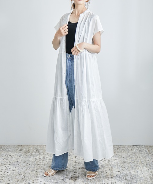 心地よく広がるティアードが愛らしいロングシャツワンピース。 ワンピースとしてはもちろん前開きで薄手の羽織としても着られるので、 好きなシルエットを選んで着回せる大人のこなれシャツワンピ。 綿100%生地の優しい風合いで着心地抜群。 暑くなる今からの時期にピッタリなコットンブラウス。 ふわっと広がるAラインロング丈なのでナチュラルに体型カバーも。 ワイドパンツやレギンス、デニムとレイヤードしても◎ フレンチスリーブで二の腕も華奢魅せしてくれます。 顔回りをすっきり見せてくれるVネックなので、デコルテも綺麗に♪ シンプルながらもきちんと感を演出してくれるロングワンピースは 春夏らしいオフホワイト・ベージュ・ブラックの3色展開です。 【備考】 ・透け感:ややあり ・伸縮性:なし 【もっとお買い物を楽しんで頂く為に】 ▼商品のお気に入り登録 お気に入りアイテムの値下げ・再入荷・在庫1点などの通知を受け取ることができます。 ▼ブランドのお気に入り登録 新作アイテム入荷や人気商品の再入荷、タイムセールやクーポンなど、いち早く「bflat」のお得な情報を受け取ることができます。