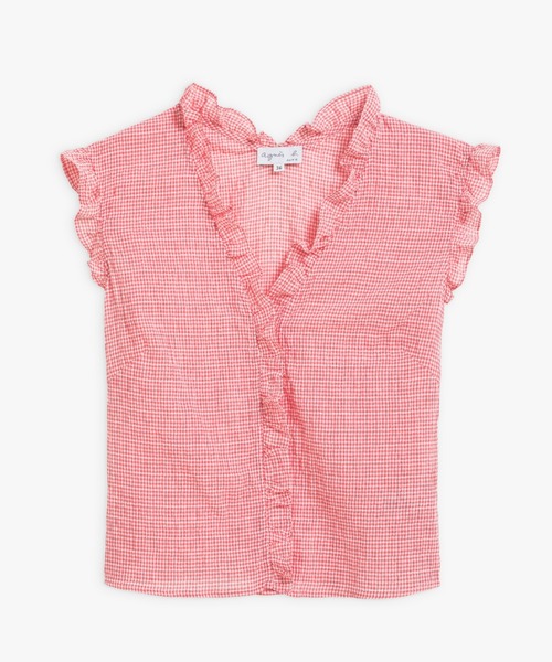 クレポン(揚柳)素材のヴィシーチェック(ギンガムチェック)のデザインブラウス。 フロントと袖部分にフリルが施された、フェミニンなデザイン。 しわ感が素材の特徴で、アイロンをかけずにお召し頂けます。 表面の凹凸が肌への接触面を少なくし、気持ちのいい肌ざわりが、夏にぴったりの素材です。