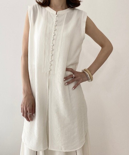 ◆前後2wayで着れる、くるみボタン楊柳ジレベスト◆ [セットアップ対応] 同生地を使用した、品番:58163350の配色パンピングフレアスカートとセットアップ対応可能な商品です。 同色で合わせていただき、ワンピースのように着ていただけます。 楊柳の軽やかな素材が季節感あふれる袖なしのジレベスト。 ミドル丈の丈感で、チュニックシャツブラウスとしても着ていただけます。 くるみボタンがアクセントになった品のあるジレです。 前後2wayで着れます。 くるみボタンを後ろにして着れば、無地のシンプルなチュニックのように着ていただけます。 肩タックのデザインや、バンドカラーの襟の仕立て、胸元の切り替えヨークデザイン、くるみ釦をあしらえたデザインなど、1枚で品のある今っぽいコーデが完成します。。 くるみボタンがを高めの位置に規則正しく配置し、くるみボタンを留めると、裾に向かってスリットが入ったようなデザインになります。 ボタン側を後ろで着るとバックスリット入りのチュニックのような雰囲気になります。 スリットからちらっとボトムスを見せてレイヤードを楽しめるデザインで抜け感も抜群です。 楊柳(ヨウリュウ)素材のほどよい表面の凹凸感がシーズンムードを高めます。 サラッとして柔らかく、肌触りのいい生地で、着心地も抜群の1枚です。 くるみボタンをはずして前開きで着ていただければ、羽織りとしても使えます。 襟なしノーカラーのバンドカラーデザインで首回りもすっきりと見せてくれます。 袖なしのノースリーブジレは1枚あるとコーデに幅の出るおすすめのトップスです。 [コーディネート] スカートやパンツとのレイヤードがしやすいロングジレです。 フレアパンツや、ストレートパンツ、シフォン生地の軽めのパンツなどを合わせていただくと、より今っぽい雰囲気でコーデが完成します。 セットアップ対応のチュニックなので、品番:58163350の配色パイピングフレアスカートと合わせていただいてワンピース風に着ていただいても可愛いです。 着回しのきく、夏におすすめのジレベストです。 [カラー] アイボリー/ブラック(黒)/オリーブ/ベージュ ※屋内外での撮影や、光量、光の当たり具合で色味が違って見える場合がございます。 また、ご覧のモニター環境により、画像の色味と多少異なる場合がございます。 ★《お気に入り登録》でお得な情報がいっぱい★ ◆商品のお気に入り登録◆ 【カートに入れる】右側のハートマークをクリック。 完売カラーの再入荷通知や、ラスト1点の通知、セールの通知も受け取ることができます。 ◆ブランドのお気に入り登録◆ ブランドタグのページからお気に入りをクリック。 新商品、新作や 人気 完売アイテムの再入荷など、いち早くブランドのお得な情報を受け取ることができます。 【She's Closet-シーズクローゼット】 おしゃれな、大人可愛いトレンドアイテムや、上品なきれいめカジュアルアイテム、かわいい韓国風アイテムなど随時入荷しております。 20代前半から、30代前後半、40代くらいまでの幅広い年齢層のお客様にマッチするような、レディースの定番アイテムからトレンドアイテムまで幅広くお取り扱いしております。