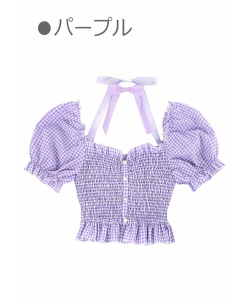 少女感たっぷりミニギンガムチェック柄 身頃部分はシャーリングゴムでピタピタ仕様 ぷっくりと膨らんだCuteなパフスリーブ スクエア襟orオフショルの2WAYで楽しめる 肩ひもを首の後ろ側にカチッと留めると 見た目もかわいいリボンチョーカーの出来上がり アクセ要らずの嬉しい仕掛けデザイン 爽やか「アボカド」ミステリアスな「パープル」 くすみ「ピンク」の3色展開だよ
