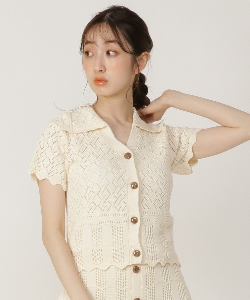 ◇REDYAZEL(レディアゼル)の透かし編み襟付きカーディガン 涼し気な透かし編みニットを使用したカーディガン。 カーディガンとして羽織るのも、ボタンを留めてプルオーバーのように着こなすのも◎ 同素材のスカートも展開しているので、セットアップで着るのもおすすめです。 F:着丈43.5cm 肩幅34cm バスト39cm 袖丈13.5cm