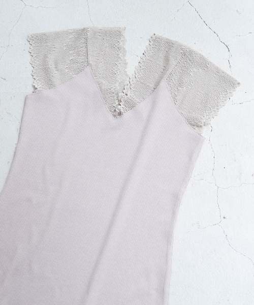 頼れるインナーがあれば、夏のオシャレがもっと楽しくなる!【素材感】・伸縮性のあるテレコ生地。・チクチクしにくいなめらかな生地感。【デザイン・シルエット】・袖を繊細なレースで切り替えた、テレコ素材のVネックトップス。・ネックラインがきれいに引き立つ、こだわりのV字カッティングが特徴。【カラー】・ブラック、オフホワイト、ブラウン系のベーシックカラー3色展開。・ブラウン系(22)は、ピンクベージュのような色味になります。【スタイリングポイント】・トレンドのシアーブラウスのインナーに一押し。-----------------------------裏地:なし透け感:なし(オフホワイト(15)はややあり)伸縮性:あり生地感・厚さ:やや薄手季節:春~秋-----------------------------※撮影時の光、お使いのモニター環境によって色の見え方が違う場合がございます。※モデル身長:165cm 着用サイズ:38