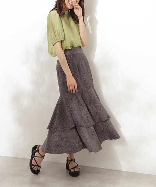 歩くたびに揺れ動くティアードスカート。ウエストベルト部分を太幅で切り替え、腰から裾にかけて落ち感のあるシルエットです。裾の途中でティアードを取り入れることで、ヘムラインに分量が増し、動きが生まれるフェミニンな1枚。遠目から見るとレオパードや小花柄のように見える抽象的なプリント柄がアクセントになり、大人な印象で着られます。※左ファスナー付き・後ろウエストゴム・裏地付き